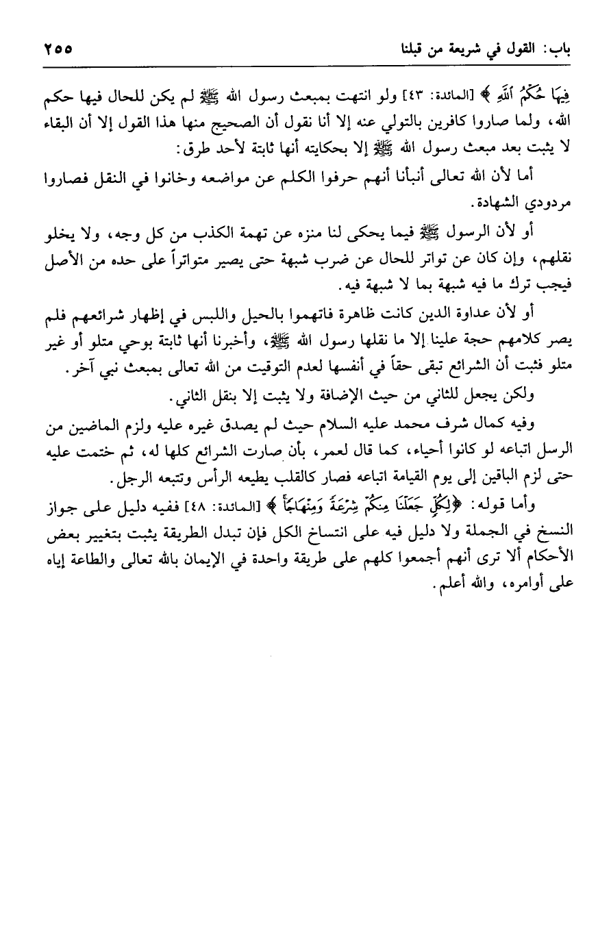 وأما قوله: {لكل جعلنا منكم شرعة ومنهاجا} ففيه دليل على جواز النسخ في الجملة ولا دليل فيه على انتساخ الكل فإن تبدل الطريقة يثبت بتغيير بعض الأحكام ألا ترى أنهم أجمعوا كلهم على طريقة واحدة في الإيمان بالله تعالى والطاعة إياه على أوامره، والله أعلم.