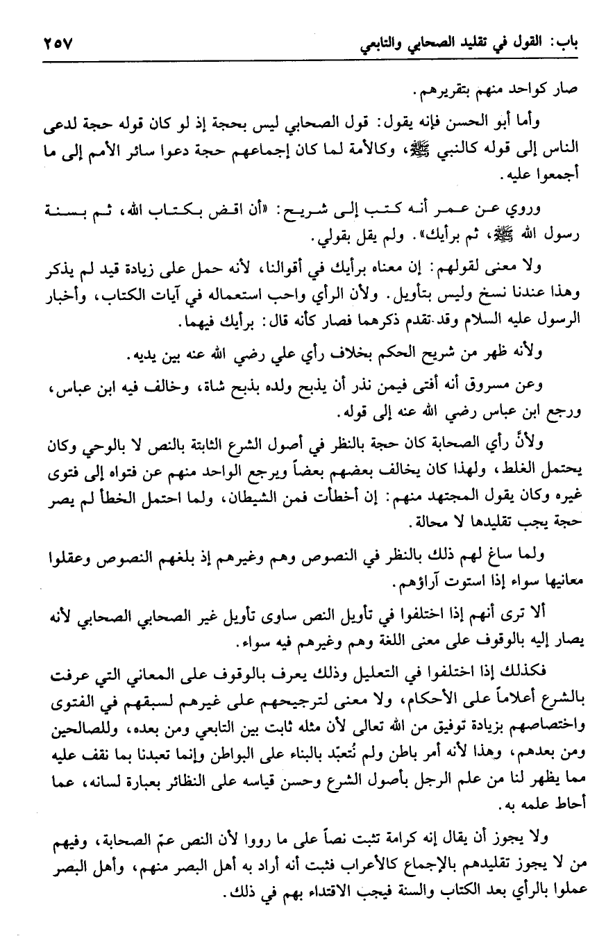 ولأن رأي الصحابة كان حجة بالنظر في أصول الشرع الثابتة بالنص لا بالوحي وكان يحتمل الغلط، ولهذا كان يخالف بعضهم بعضًا ويرجع الواحد منهم عن فتواه إلى فتوى غيره وكان يقول المجتهد منهم: إن أخطأت فمن الشيطان، ولما احتمل الخطأ لم يصر حجة يجب تقليدها لا محالة.