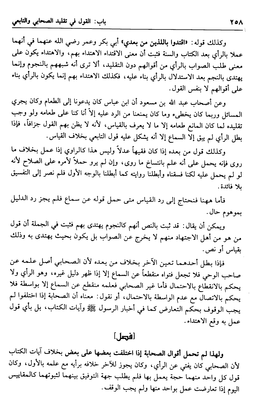 وكذلك قوله: "اقتدوا باللذين من بعدي" أبي بكر وعمر رضي الله عنهما في أنهما عملا بالرأي بعد الكتاب والسنة فثبت أن معنى الاقتداء الاهتداء بهم، والاهتداء يكون على معنى طلب الصواب بالرأي من أقوالهم دون التقليد، ألا ترى أنه شبههم بالنجوم وإنما يهتدى بالنجم بعد الاستدلال بالرأي بناء عليه، فكذلك الاهتداء بهم إنما يكون بالرأي بناء على أقوالهم لا بنفس القول.