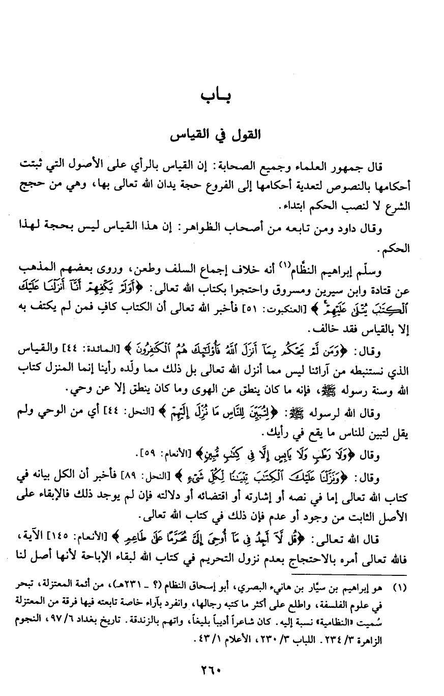 وسلم إبراهيم النظام أنه خلاف إجماع السلف وطعن، وروى بعضهم المذهب عن قتادة وابن سيرين ومسروق واحتجوا بكتاب الله تعالى: {أولم يكفهم أنا أنزلنا عليك الكتاب يتلى عليهم} فأخبر الله تعالى أن الكتاب كاف فمن لم يكتف به إلا بالقياس فقد خالف.