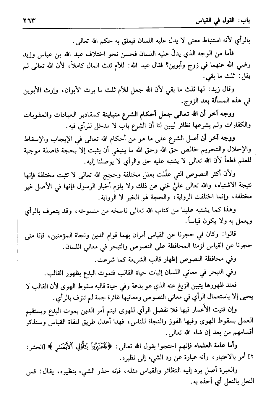 وأما عامة العلماء فإنهم احتجوا بقول الله تعالى: {فاعتبروا يا أولي الأبصار} أمر بالاعتبار، وأنه عبارة عن رد الشيء إلى نظيره.