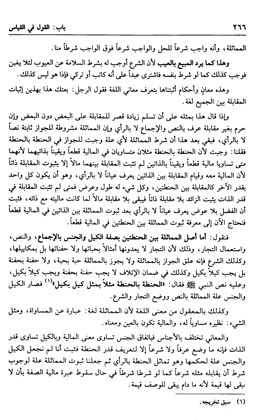 وإذا قال هذا بمثله على أن تسلم زيادة قصر للمقابلة على البعض دون البعض وإن حرم بغير مقابلة عرف بالنص والإجماع لا بالرأي وإن المماثلة مشروطة للجواز ثابتة نصًا لا بالرأي، فبقي بعد هذا أن شرط المماثلة لأي علة وجبت للجواز في الحنطة بالحنطة فقلنا: وجبت لأن الحنطة بالحنطة مثلان متساويان في المالية قطعًا ويقينًا بذاتيهما لأنهما متى تساويا مالية قطعًا ويقينًا بالذاتين لم تثبت المقابلة بينهما مالًا إلا بثبوت المقابلة ذاتًا لأن المالية معه وقيام المقابلة بين الذاتين يعرف عيانًا لا بالرأي، وهو أن يكون كل واحد بقدر الآخر كالمقابلة بين الحنطتين، وكل شيء له طول وعرض فمتى لم تثبت المقابلة في قدر الذات يثبت الزائد بلا مقابلة ذاتًا فيبقى بلا مقابلة مالًا لما كانت ماليته مع ذاته، فثبت أن الفضل بلا عوض يعرف عيانًا لا بالرأي بعد ثبوت المماثلة بين الذاتين في المالية قطعًا فنحتاج الآن إلى معرفة ثبوت المماثلة بين الحنطتين في المالية قطعًا.