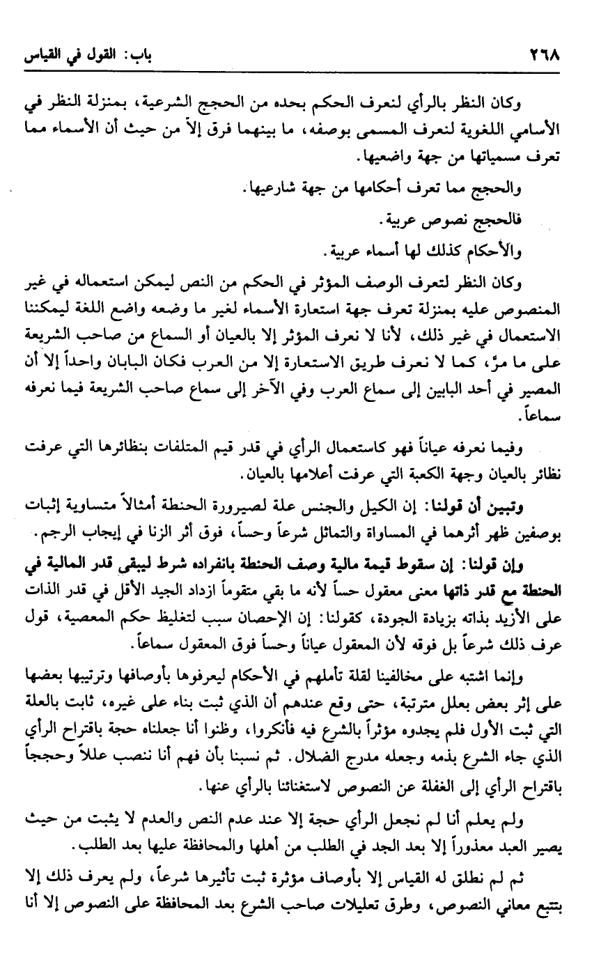 وكان النظر بالرأي لنعرف الحكم بحده من الحجج الشرعية، بمنزلة النظر في الأسامي اللغوية لنعرف المسمى بوصفه، ما بينهما فرق إلا من حيث أن الأسماء مما تعرف مسمياتها من جهة واضعيها.
