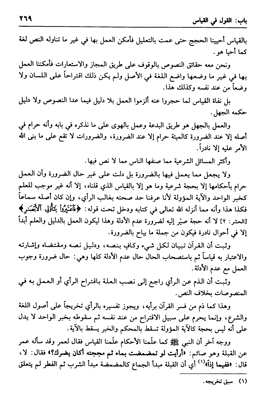ولا يجعل مما يعمل فيها بالضرورة بل دلت على غير حال الضرورة وأن العمل حرام بأحكامها إلا بحجة شرعية وما هو إلا بالقياس الذي قلناه، إلا أنه غير موجب للعلم كخبر الواحد والآية المؤولة لأنا عرفنا حد صحته بغالب الرأي، وإن كان أصله سماعًا فكذا هذا وأنه مما أنزله الله تعالى في كتابه ودخل تحت قوله: {فاعتبروا يا أولي الأبصار} لا أنه حجة صير إليه لضرورة عدم الأدلة وهذا ليكون العمل بالدليل والعلم أبدًا إلا في أحوال نادرة فيكون من جملة ما يباح بالضرورة.