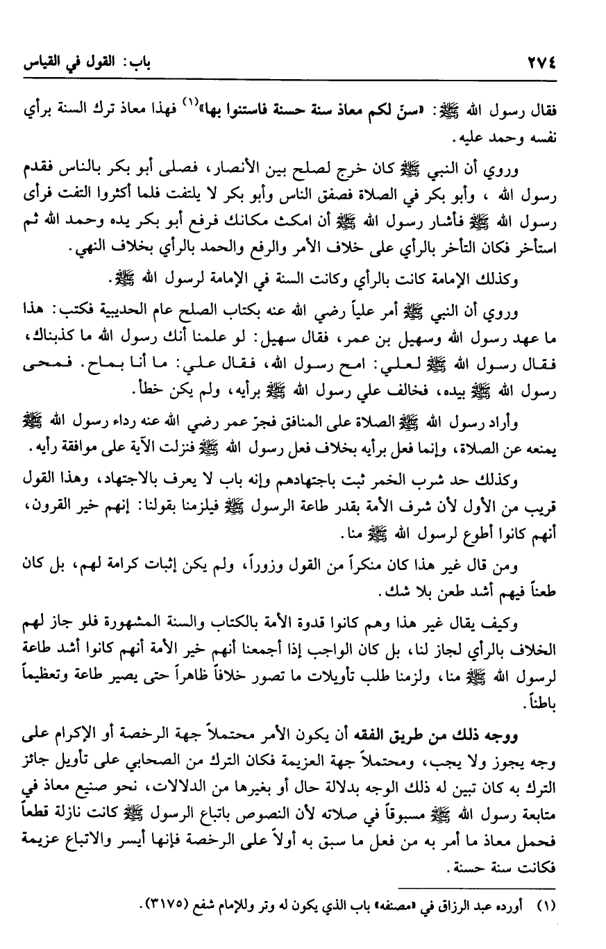 فقال رسول الله صلى الله عليه وسلم: "سن لكم معاذ سنة حسنة فاستنوا بها" فهذا معاذ ترك السنة برأي نفسه وحمد عليه.