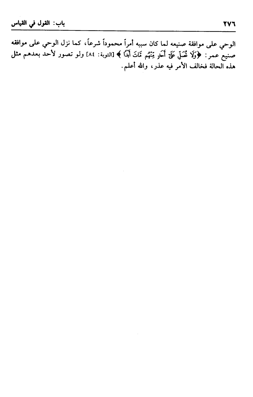 الوحي على موافقة صنيعه لما كان سببه أمرًا محمودًا شرعًا، كما نزل الوحي على موافقة صنيع عمر: {ولا تصل على أحد منهم مات أبدًا} ولو تصور لأحد بعدهم مثل هذه الحالة فخالف الأمر فيه عذر، والله أعلم.