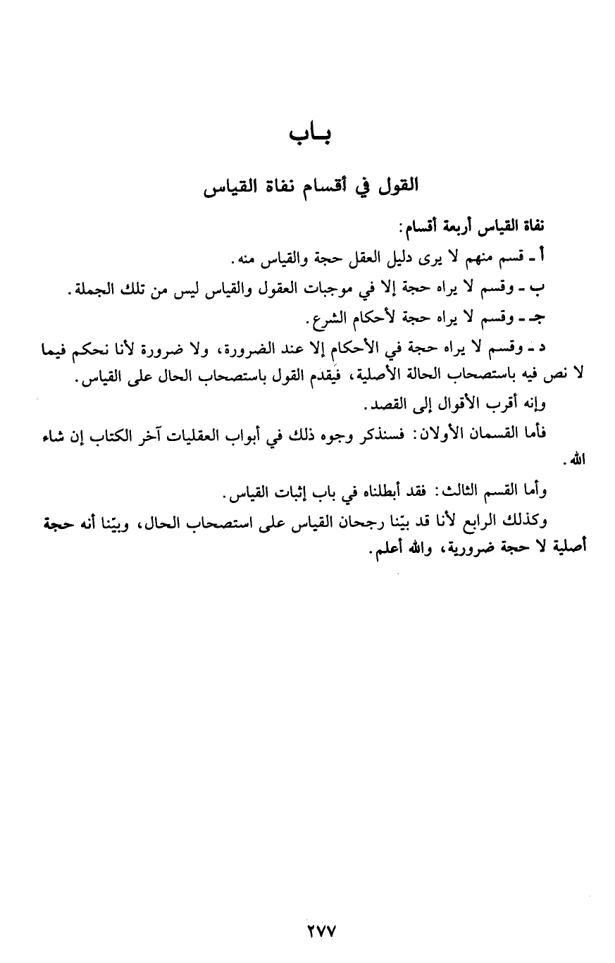 د- وقسم لا يراه حجة في الأحكام إلا عند الضرورة، ولا ضرورة لأنا نحكم فيما نص فيه باستصحاب الحالة الأصلية، فيقدم القول باستصحاب الحال على القياس.