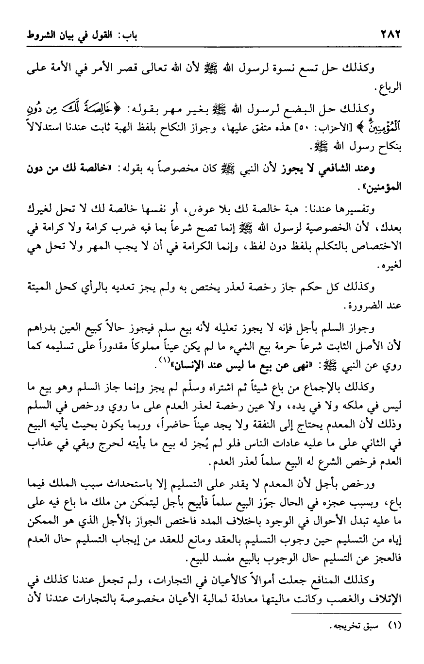 وجواز السلم بأجل فإنه لا يجوز تعليله لأنه بيع سلم فيجوز حالًا كبيع العين بدراهم لأن الأصل الثابت شرعًا حرمة بيع الشيء ما لم يكن عينًا مملوكًا مقدورًا على تسليمه كما روي عن النبي صلى الله عليه وسلم: "نهى عن بيع ما ليس عند الإنسان".