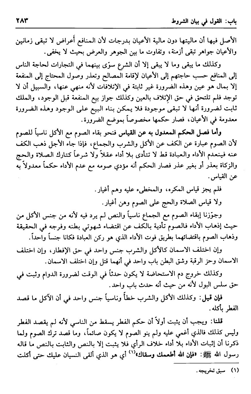 وأما فصل الحكم المعدول به عن القياس فنحو بقاء الصوم مع الأكل ناسيًا للصوم لأن الصوم عبارة عن الكف عن الأكل والشرب والجماع، فإذا جاء الأجل ذهب الكف عنه فينعدم الأداء والعبادة قط لا تتأدى بلا أداء عقلًا ولا شرعًا كتارك الصلاة والحج والزكاة بعذر أو بغير عذر فصار الحكم أنه مؤدي صومه مع عدم الأداء حكمًا معدولًا به عن القياس.