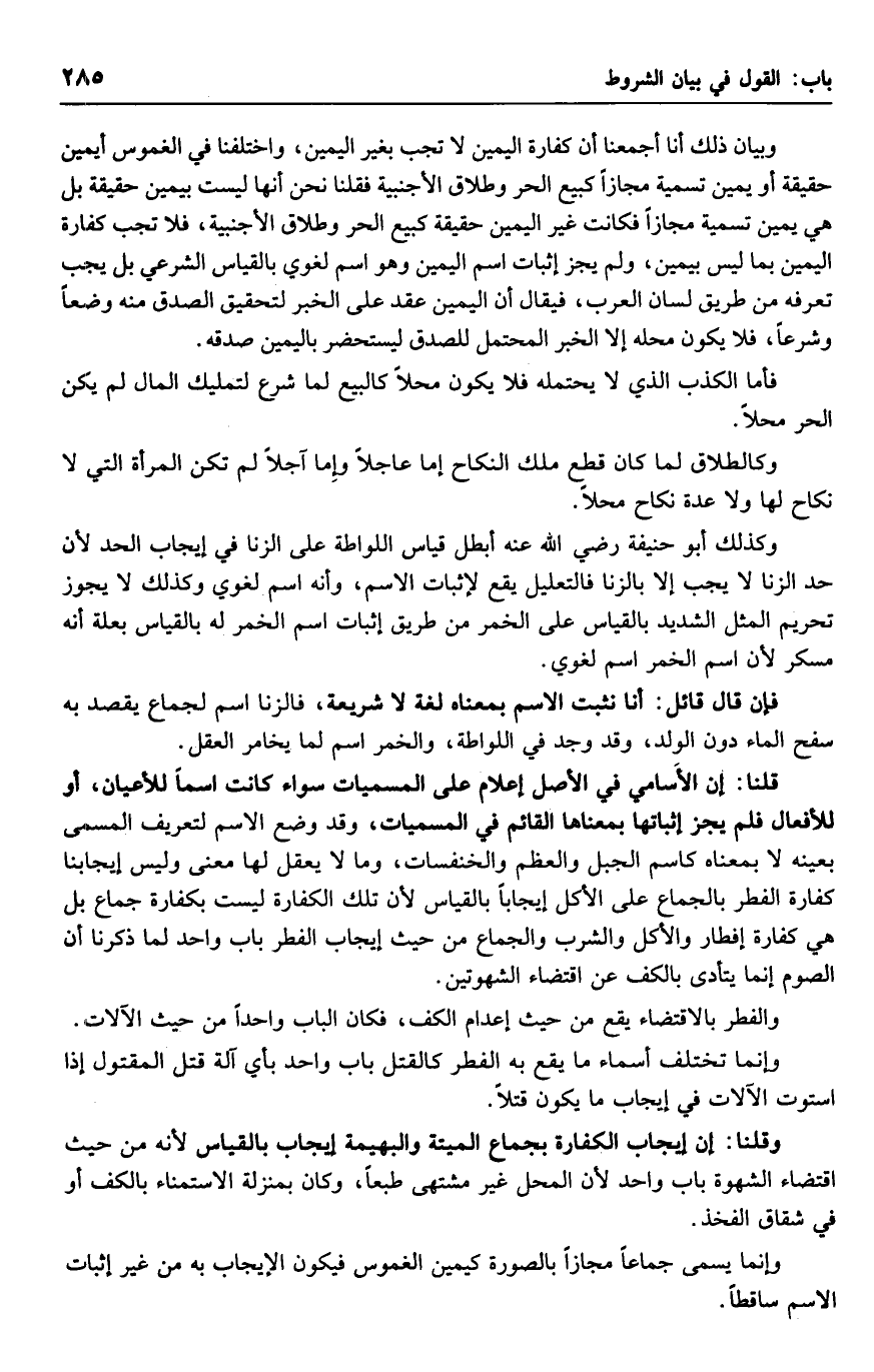 وبيان ذلك أنا أجمعنا أن كفارة اليمين لا تجب بغير اليمين، واختلفنا في الغموس أيمين حقيقة أو يمين تسمية مجازًا كبيع الحر وطلاق الأجنبية فقلنا نحن أنها ليست بيمين حقيقة بل هي يمين تسمية مجازًا فكانت غير اليمين حقيقة كبيع الحر وطلاق الأجنبية، فلا تجب كفارة اليمين بما ليس بيمين، ولم يجز إثبات اسم اليمين وهو اسم لغوي بالقياس الشرعي بل يجب تعرفه من طريق لسان العرب، فيقال أن اليمين عقد على الخبر لتحقيق الصدق منه وضعًا وشرعًا، فلا يكون محله إلا الخبر المحتمل للصدق ليستحضر باليمين صدقه.