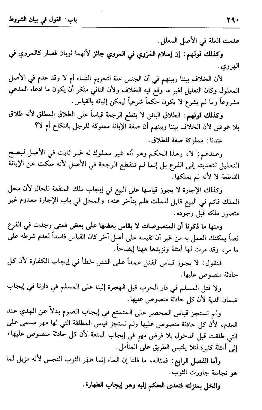 وأما الفصل الرابع: فمثاله، ما قلنا إن الماء إنما طهر الثوب النجس لأنه مزيل لما هو نجاسة جاورت الثوب.