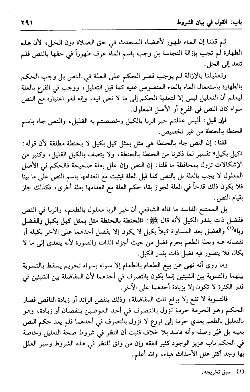 فالتسوية لا تقع إلا برفع تلك المفاضلة، وذلك بنقص الزائد أو زيادة الناقص فصار الحكم وهو الحرمة حرمة تزول بالتصرف في أحد العوضين بنقصان أو زيادة، وهو بالتعليل بالطعم يعدي حرمة إلى فروع لا تزول بالتصرف في أحدهما فلم يعد حكم النص بعينه بل غير وصفه وأنه فاسد بلا خلاف فثبت أن النظر في شروطه صحة التعليل وخاصة في الحكم باب عزيز الوجود كثير الفقه وإن من وفق للنظر في هذه الشروط وسبر العلل بها وجد أكثر علل الأحداث هباء، والله أعلم.