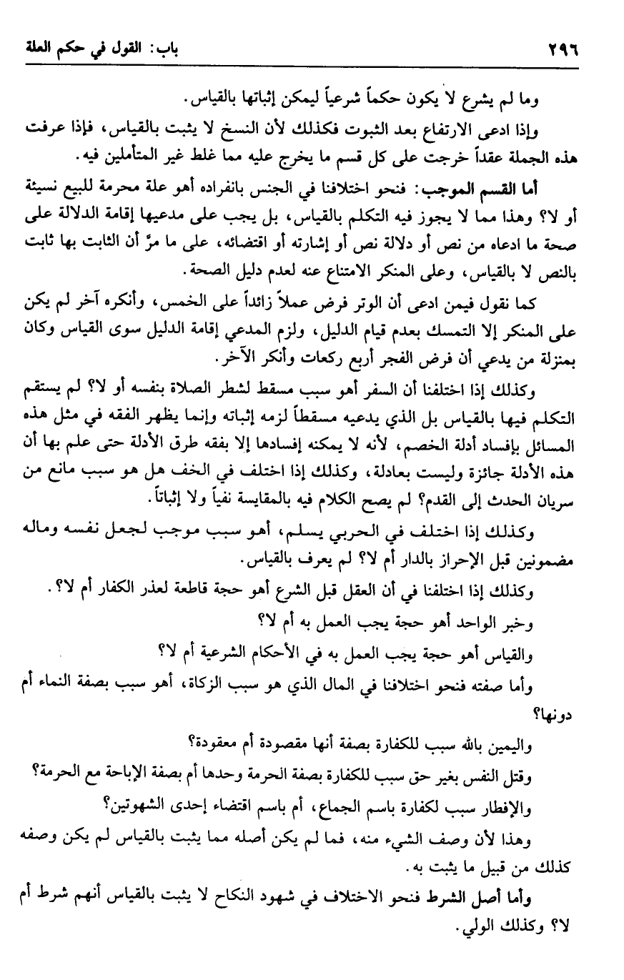 أما القسم الموجب: فنحو اختلافنا في الجنس بانفراده أهو علة محرمة للبيع نسيئة أو لا؟ وهذا مما لا يجوز فيه التكلم بالقياس، بل يجب على مدعيها إقامة الدلالة على صحة ما ادعاه من نص أو دلالة نص أو إشارته أو اقتضائه، على ما مر أن الثابت بها ثابت بالنص لا بالقياس، وعلى المنكر الامتناع عنه لعدم دليل الصحة.