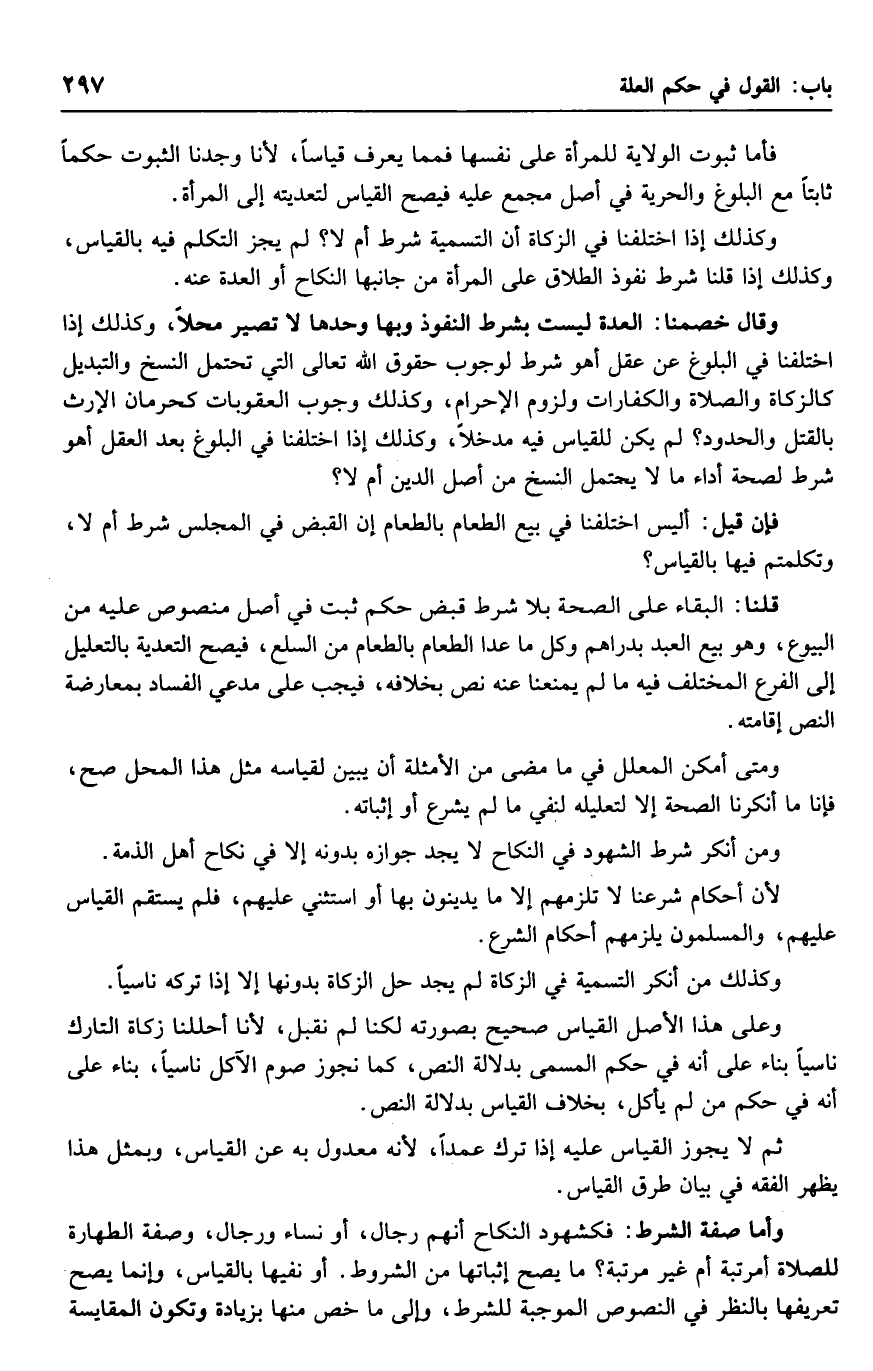 وقال خصمنا: العدة ليست بشرط النفوذ وبها وحدها لا تصير محلًا، وكذلك إذا اختلفنا في البلوغ عن عقل أهو شرط لوجوب حقوق الله تعالى التي تحتمل النسخ والتبديل كالزكاة والصلاة والكفارات ولزوم الإحرام، وكذلك وجوب العقوبات كحرمان الإرث بالقتل والحدود؟ لم يكن للقياس فيه مدخلًا، وكذلك إذا اختلفنا في البلوغ بعد العقل أهو شرط لصحة أداء ما لا يحتمل النسخ من أصل الدين أم لا؟