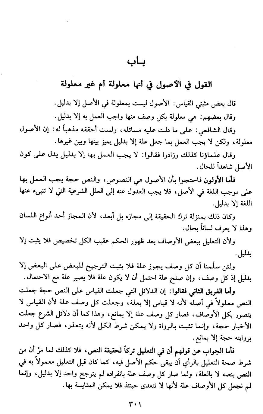 فأما الأولون فاحتجوا بأن الأصول هي النصوص، والنص حجة يجب العمل بها على موجب اللغة في الأصل، فلا يجب العدول عنه إلى العلل الشرعية التي لا تنبئ عنها اللغة إلا بدليل.