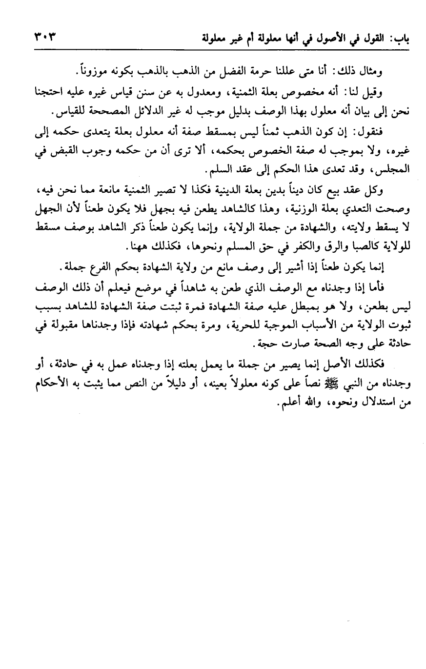 فنقول: إن كون الذهب ثمنًا ليس بمسقط صفة أنه معلول بعلة يتعدى حكمه إلى غيره، ولا بموجب له صفة الخصوص بحكمه، ألا ترى أن من حكمه وجوب القبض في المجلس، وقد تعدى هذا الحكم إلى عقد السلم.