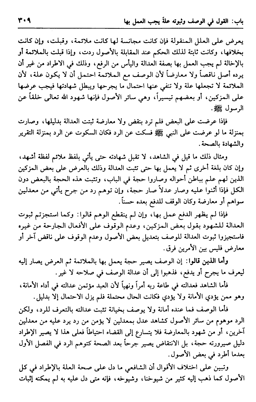 فأما الوصف فما عنده أمانة ولا يوصف بخيانة تثبت عدالته بالتعرف للرد، ولكن الرد موهوم من سائر الأصول كشاهد عدل بمعدلين لا يؤمن من رد يرد عليه من معدلين آخرين، أو من شهود بالمعارضة فلا يتسارع إلى القضاء احتياطًا فعلى هذا لا يصير الإطراد دليل صيرورته حجة، بل الانتقاض يصير جرحًا بعد الصحة كتوهم الرد في الفصل الأول بعدما أطرد في بعض الأصول.