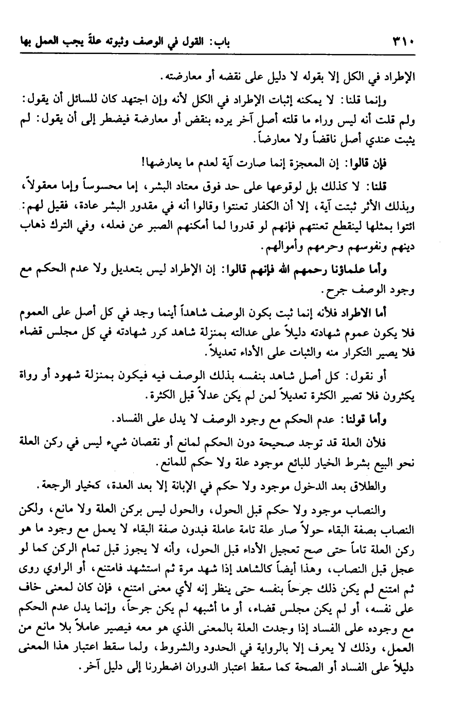 والنصاب موجود ولا حكم قبل الحول، والحول ليس بركن العلة ولا مانع، ولكن النصاب بصفة البقاء حولًا صار علة تامة عاملة فبدون صفة البقاء لا يعمل مع وجود ما هو ركن العلة تامًا حتى صح تعجيل الأداء قبل الحول، وأنه لا يجوز قبل تمام الركن كما لو عجل قبل النصاب، وهذا أيضًا كالشاهد إذا شهد مرة ثم استشهد فامتنع، أو الراوي روى ثم امتنع لم يكن ذلك جرحًا بنفسه حتى ينظر إنه لأي معنى امتنع، فإن كان لمعنى خاف على نفسه، أو لم يكن مجلس قضاء، أو ما أشبهه لم يكن جرحًا، وإنما يدل على عدم الحكم مع وجوده على الفساد إذا وجدت العلة بالمعنى الذي هو معه فيصير عاملًا بلا مانع من العمل، وذلك لا يعرف إلا بالرواية في الحدود والشروط، ولما سقط اعتبار هذا المعنى دليلًا على الفساد أو الصحة كما سقط اعتبار الدوران اضطررنا إلى دليل آخر.