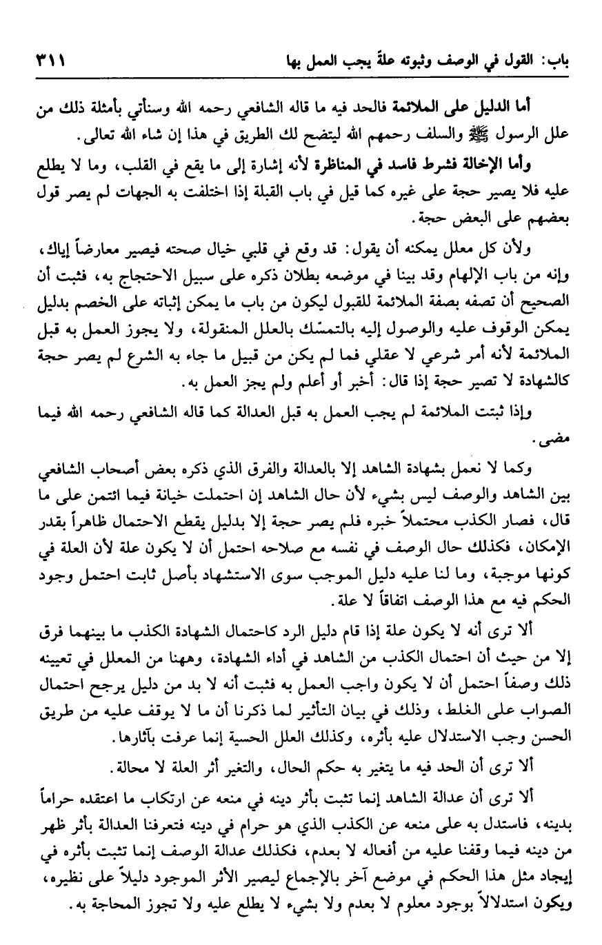 وكما لا نعمل بشهادة الشاهد إلا بالعدالة والفرق الذي ذكره بعض أصاب الشافعي بين الشاهد والوصف ليس بشيء لأن حال الشاهد إن احتلمت خيانة فيما ائتمن على ما قال، فصار الكذب محتملًا خبره فلم يصر حجة إلا بدليل يقطع الاحتمال ظاهرًا بقدر الإمكان، فكذلك حال الوصف في نفسه مع صلاحه احتمل أن لا يكون علة لأن العلة في كونها موجبة، وما لنا عليه دليل الموجب سوى الاستشهاد بأصل ثابت احتمل وجود الحكم فيه مع هذا الوصف اتفاقًا لا علة.
