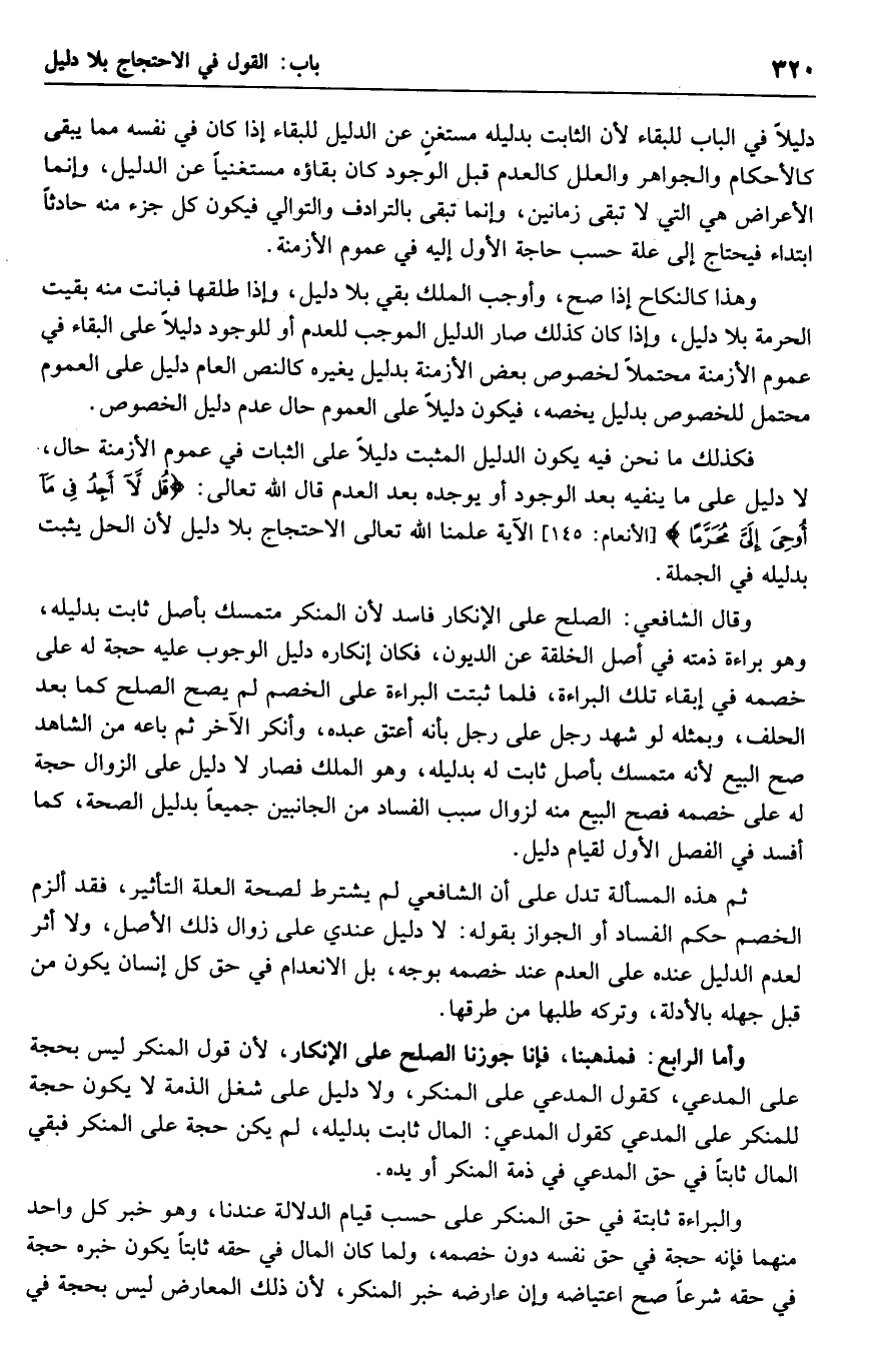 فكذلك ما نحن فيه يكون الدليل المثبت دليلًا على الثبات في عموم الأزمنة حال، لا دليل على ما ينفيه بعد الوجود أو يوجده بعد العدم قال الله تعالى: {قل لا أجد في ما أوحي إلي محرمًا} الآية علمنا الله تعالى الاحتجاج بلا دليل لأن الحل يثبت بدليله في الجملة.