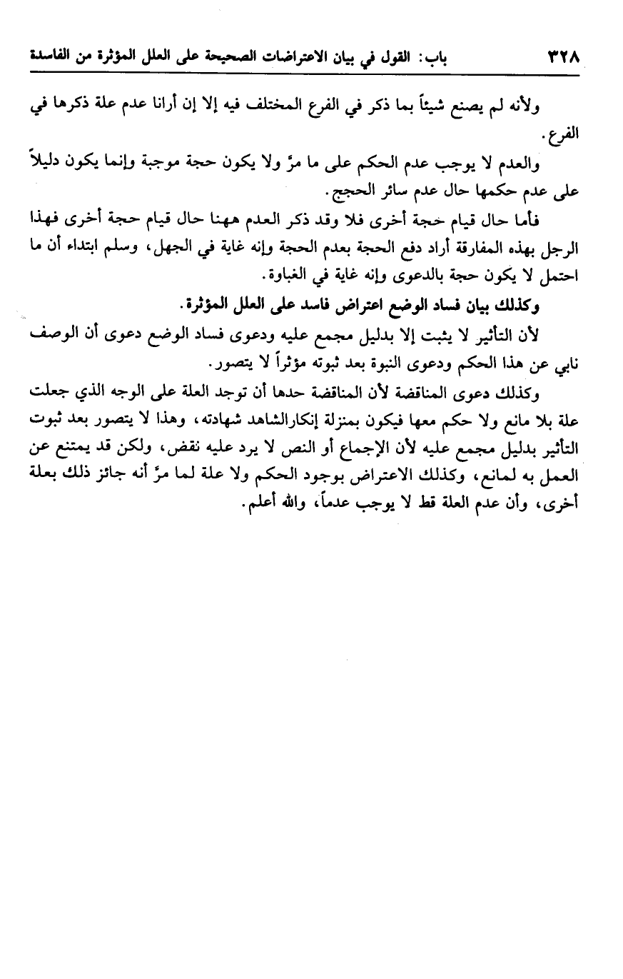 وكذلك دعوى المناقضة لأن المناقضة حدها أن توجد العلة على الوجه الذي جعلت علة بلا مانع ولا حكم معها فيكون بمنزلة إنكار الشاهد شهادته، وهذا لا يتصور بعد ثبوت التأثير بدليل مجمع عليه لأن الإجماع أو النص لا يرد عليه نقض، ولكن قد يمتنع عن العمل به لمانع، وكذلك الاعتراض بوجود الحكم ولا علة لما مر أنه جائز ذلك بعلة أخرى، وأن عدم العلة قط لا يوجب عدمًا، والله أعلم.