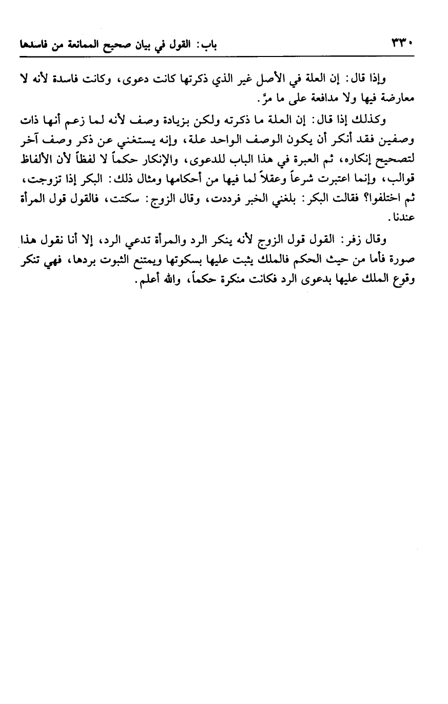 وكذلك إذا قال: إن العلة ما ذكرته ولكن بزيادة وصف لأنه لما زعم أنها ذات وصفين فقد أنكر أن يكون الوصف الواحد علة، وإنه يستغني عن ذكر وصف آخر لتصحيح إنكاره، ثم العبرة في هذا الباب للدعوى، والإنكار حكمًا لا لفظًا لأن الألفاظ قوالب، وإنما اعتبرت شرعًا وعقلًا لما فيها من أحكامها ومثال ذلك: البكر إذا تزوجت، ثم اختلفوا؟ فقالت البكر: بلغني الخبر فرددت، وقال الزوج: سكتت، فالقول قول المرأة عندنا.