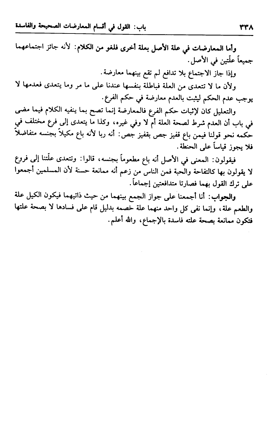 والجواب: أنا جمعنا على جواز الجمع بينهما من حيث ذاتيهما فيكون الكيل علة والطعم علة، وغنما نفى كل واحد منهما علة خصمه بدليل قام على فسادها لا بصحة علتها فتكون ممانعة بصحة علته فاسدة بالإجماع، والله أعلم.