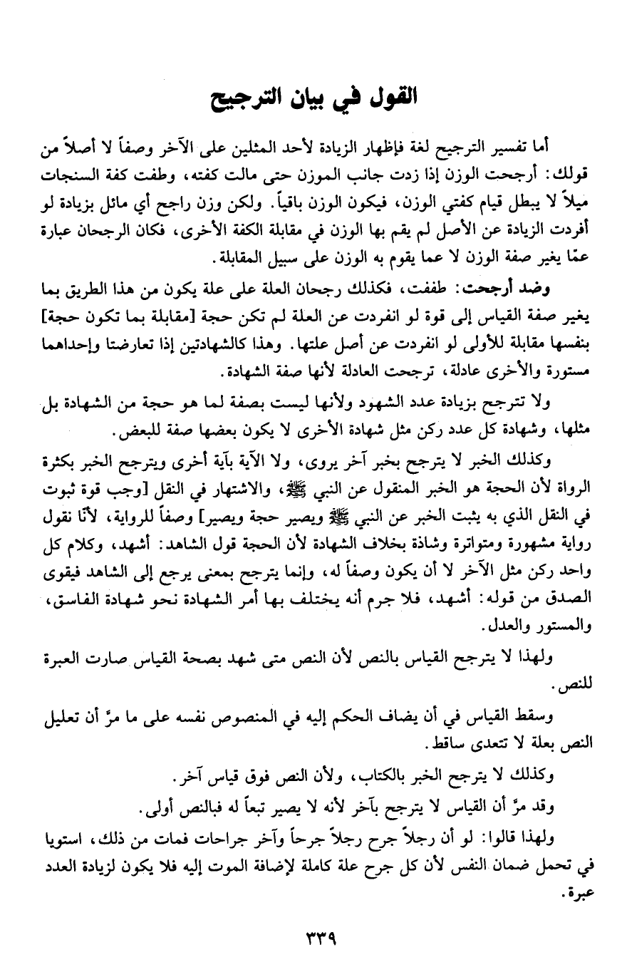 أما تفسير الترجيح لغة فإظهار الزيادة لأحد الممثلين على الآخر وصفًا لا أصلًا من قولك: أرجحت الوزن إذا زدت جانب الموزن حتى مالت كفته، وطفت كفة السنجات ميلًا لا يبطل قيام كفتي الوزن، فيكون الوزن باقيًا. ولكن وزن راجح أي مائل بزيادة لو أفردت الزيادة عن الأصل لم يقم بها الوزن في مقابلة الكفة الأخرى، فكان الرجحان عبارة عما يغير صفة الوزن لا عما يقوم به الوزن على سبيل المقابلة.