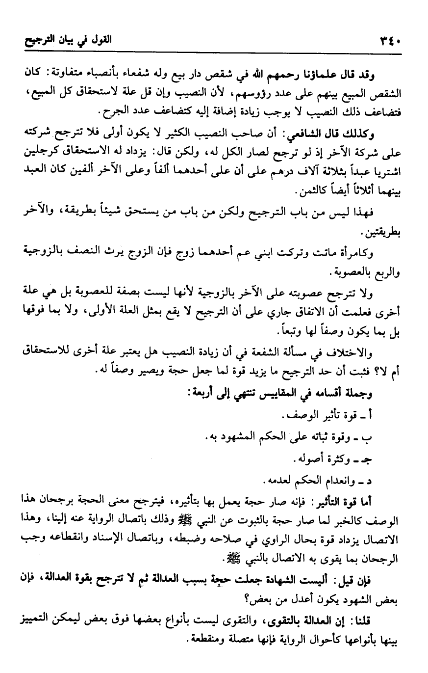 والاختلاف في مسألة الشفعة في أن زيادة النصيب هل يعتبر علة أخرى للاستحقاق أم لا؟ فثبت أن حد الترجيح ما يزيد قوة لما جعل حجة ويصير وصفًا له.