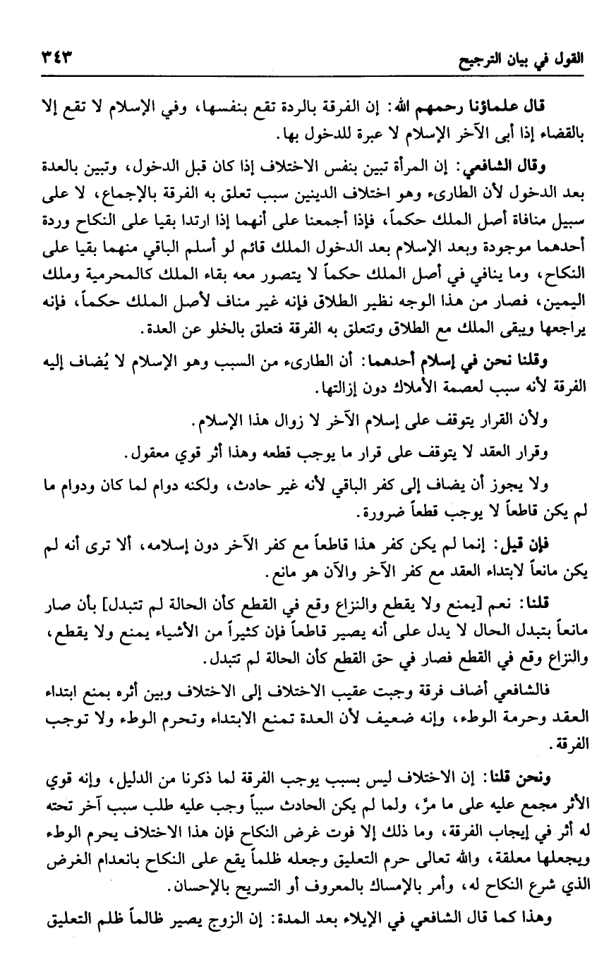 وقلنا نحن فى إسلام أحدهما: أن الطارئ من السبب وهو الإسلام لا يُضاف إليه الفرق لأنه سبب لعصمة الأملاك دون إزالتها.