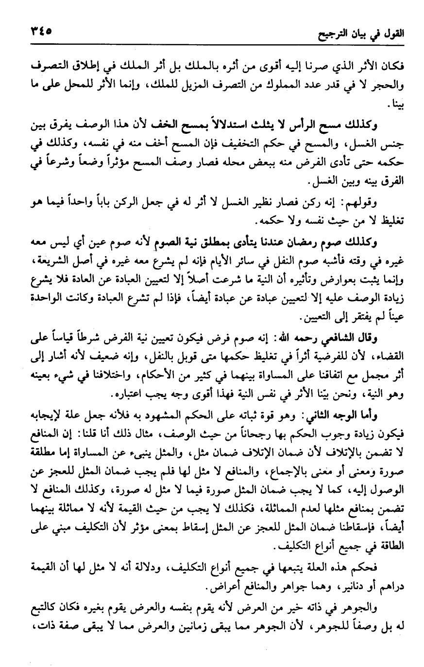 وأما الوجه الثاني: وهو قوة ثباته على الحكم المشهود به فلأنه جعل علة لإيجابه فيكون زيادة وجوب الحكم بها رجحانًا من حيث الوصف، مثال ذلك أنا قلنا: إن المنافع لا تضمن بالإتلاف لأن ضمان مثل، والمثل بنبئ عن المساواة إما مطلقة صورة ومعنى أو معنى بالإجماع، والمنافع لا مثل لها فلم يجب ضمان المثل للعجز عن الوصول إليه، كما لا يجب ضمان المثل صورة فيما لا مثل له من صورة، وكذلك المنافع لا تضمن بمنافع مثلها لعدم المماثلة، فكذلك لا يجب من حيث القيمة لأنه لا مماثلة بينهما أيضًا، فإسقاطنا ضمان المثل للعجز عن المثل إسقاط بمعنى مؤثر لأن التكليف مبني على الطاقة في جميع أنواع التكليف.