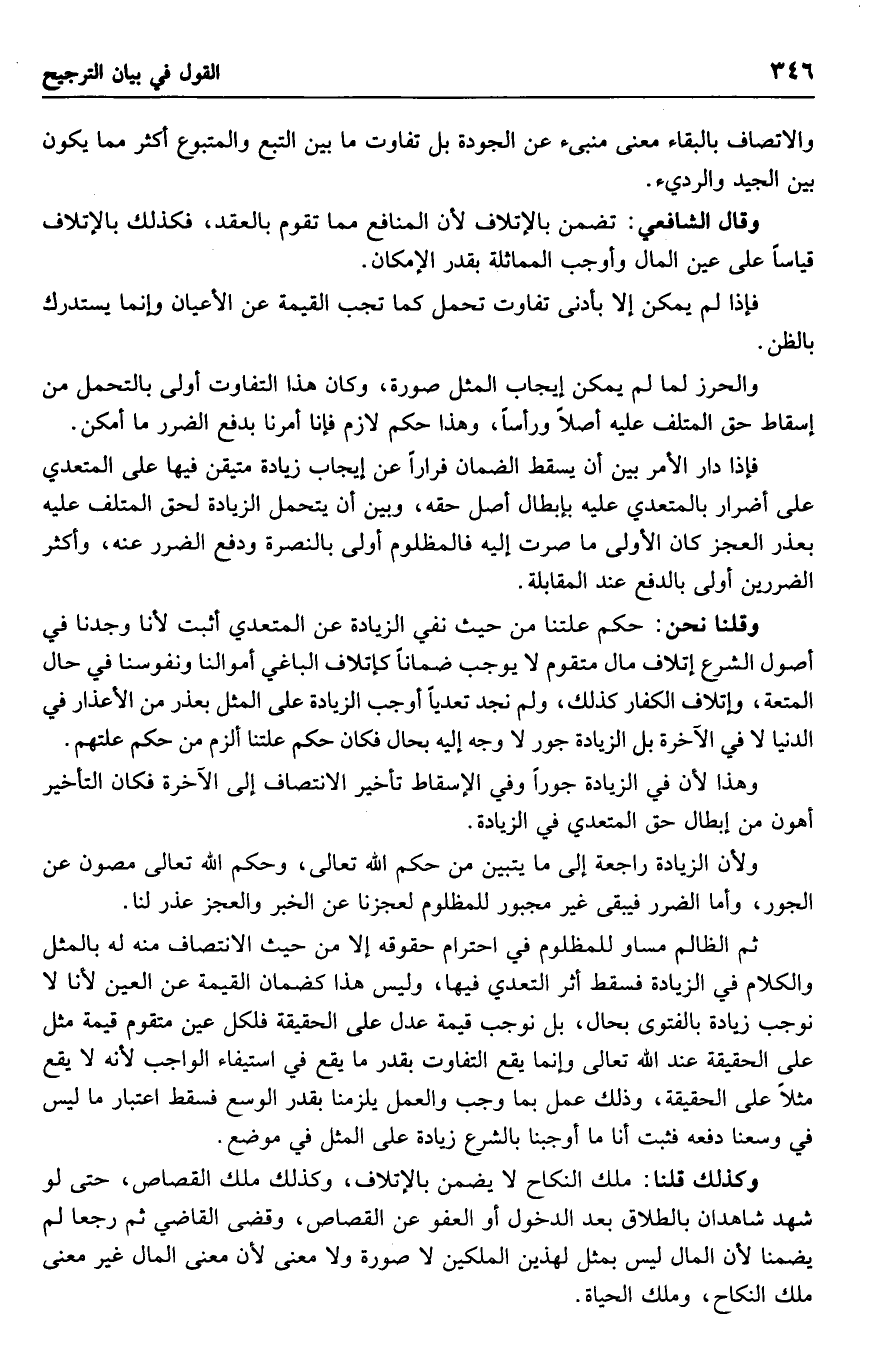 فإذا دار الأمر بين أن يسقط الضمان فرارًا عن إيجاب زيادة متيقن فيها على المتعدي على أضرار بالمتعدي عليه بإبطال أصل حقه، وبين أن يتحمل الزيادة لحق المتلف عليه بعذر العجز كان الأولى ما صرت إليه فالمظلوم أولى بالنصرة ودفع الضرر عنه، وأكثر الضررين أولى بالدفع عند المقابلة.