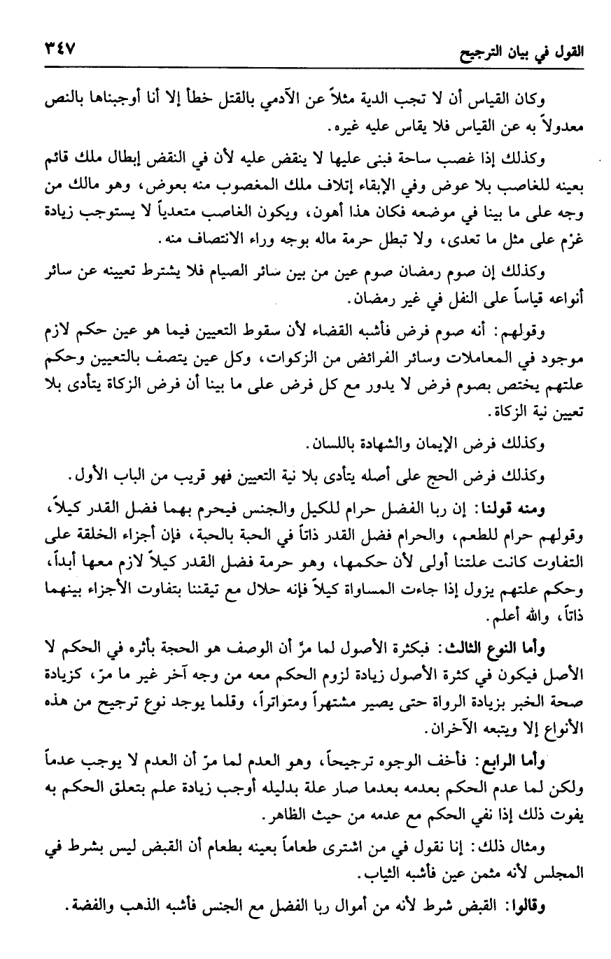 ومنه قولنا: إن ربا الفضل حرام للكيل والجنس فيحرم بهما فضل القدر كيلًا، وقولهم حرام للطعم، والحرام فضل القدر ذاتًا في الحبة بالحبة، فإن أجزاء الخلقة على التفاوت كانت علتنا أولى لأن حكمها، وهو حرمة فضل القدر كيلًا لازم معها أبدًا، وحكم علتهم يزول إذا جاءت المساواة كيلًا فإنه حلال مع تيقننا بتفاوت الأجزاء بينهما ذاتًا، والله أعلم.