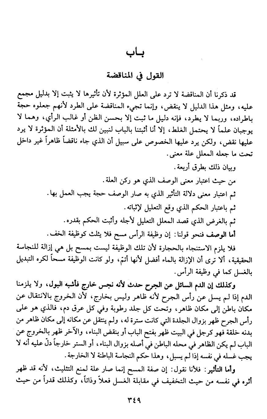 قد ذكرنا أن المناقضة لا ترد على العلل المؤثرة لأن تأثيرها لا يثبت إلا بدليل مجمع عليه، ومثل هذا الدليل لا ينقض، وإنما تجيء المناقضة على الطرد لأنهم جعلوه حجة باطراده، وربما لا يطرد، فإنه دليل ما ثبت إلا بحسن الظن أو غالب الرأي، وهما لا يوجبان علمًا لا يحتمل الغلط، إلا أنا أثبتنا بالباب لنبين لك بالأمثلة أن المؤثرة لا يرد عليها نقض، ولكن يرد عليها الخصوص على سبيل أن الذي جاء ناقضًا ظاهرًا غير داخل تحت ما جعله المعلل علة معنى.
