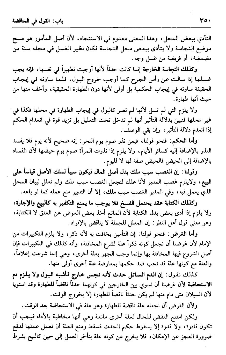 ولكن امتنع النقض للحالة لعلة أخرى مانعة وهي أنها مخاطبة بالأداء فيجب أن تكون قادرة، ولا قدرة إلا بسقوط حكم الحدث فسقط ومنع العلة أن تعمل عملها لدفع ضرورة العجز عن الإمكان، فلا يخرج عن كونه علة بتأخر العمل إلى حين كالبيع بشرط