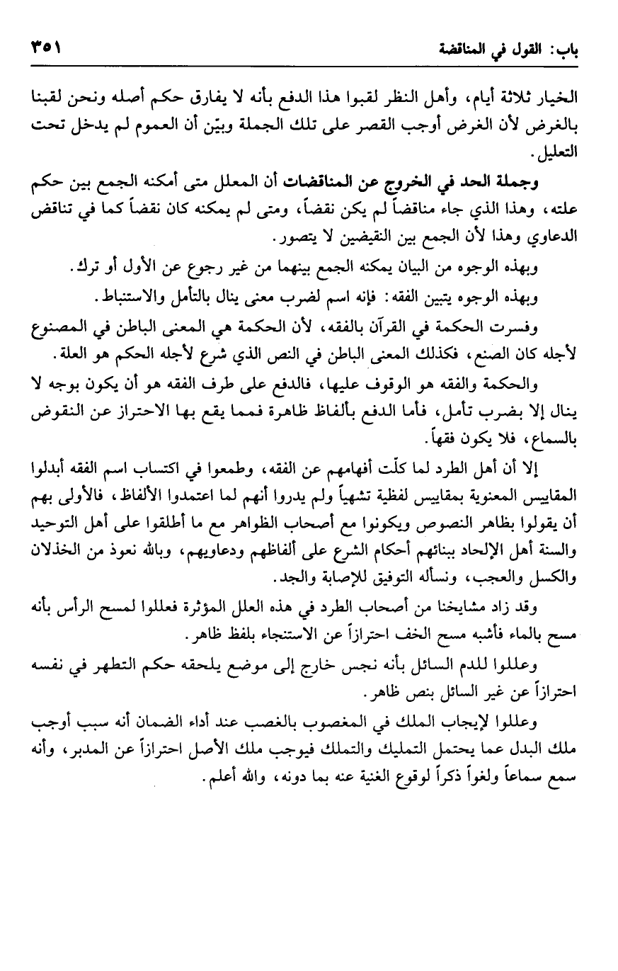 وجملة الحد في الخروج عن المناقضات أن المعلل متى أمكنه الجمع بين حكم علته، وهذا الذي جاء مناقضا لم يكن نقضا، ومتى لم يمكنه كان نقضا كما في تناقض الدعاوي وهذا لأن الجمع بين النقيضين لا يتصور.