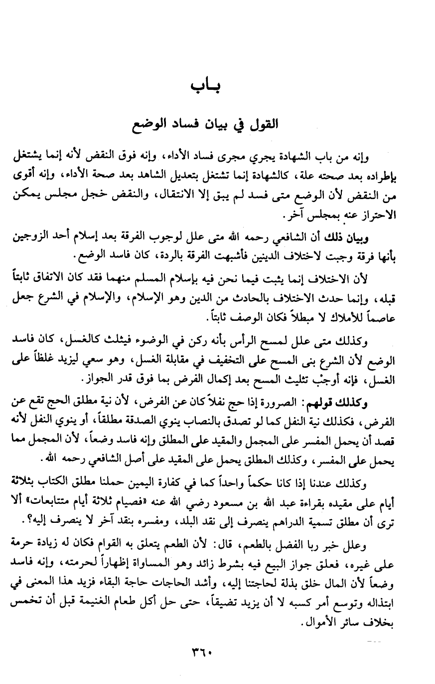 وعلل خبر ربا الفضل بالطعم، قال: لأن الطعم يتعلق به القوام فكان له زيادة حرمة على غيره، فعلق جواز البيع فيه بشرط زائد وهو المساواة إظهارا لحرمته، وإنه فاسد وضعا لأن المال خلق بذلة لحاجتنا إليه، وأشد الحاجات حاجة البقاء فزيد هذا المعنى في ابتذاله وتوسع أمر كسبه لا أن يزيد تضيقا، حتى حل أكل طعام الغنيمة قبل أن تخمس بخلاف سائر الأموال.