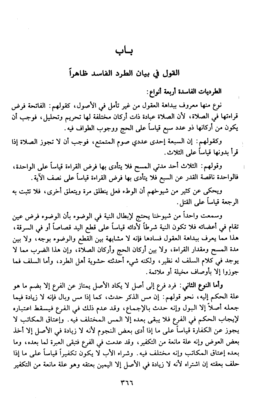 وسمعت واحدا من شيوخنا يحتج لإبطال النية في الوضوء بأن الوضوء فرض عين تقام في أعضائه فلا تكون النية شرطا لأدائه قياسا على قطع اليد قصاصا أو في السرقة، هذا مما يعرف ببداهة العقول فسادها فإنه لا مشابهة بين القطع والوضوء بوجه، ولا بين مدة المسح ومقدار القراءة، ولا بين أركان الحج وأركان الصلاة، وإن هذا الضرب مما لا يوجد في كلام السلف له نظير، ولكنه شيء أحدثته حشوية أهل الطرد، وأما السلف فما جوزوا إلا بأوصاف مخيلة أو ملائمة.