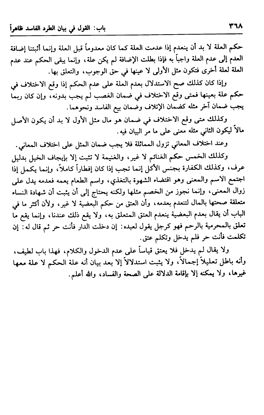 وإذا كان كذلك صح الاستدلال بعدم العلة على عدم الحكم إذا وقع الاختلاف في حكم علة بعينها فمتى وقع الاختلاف في ضمان الغصب لم يجب بدونه، وإن كان ربما يجب ضمان آخر مثله كضمان الإتلاف وضمان بيع الفاسد ونحوهما.
