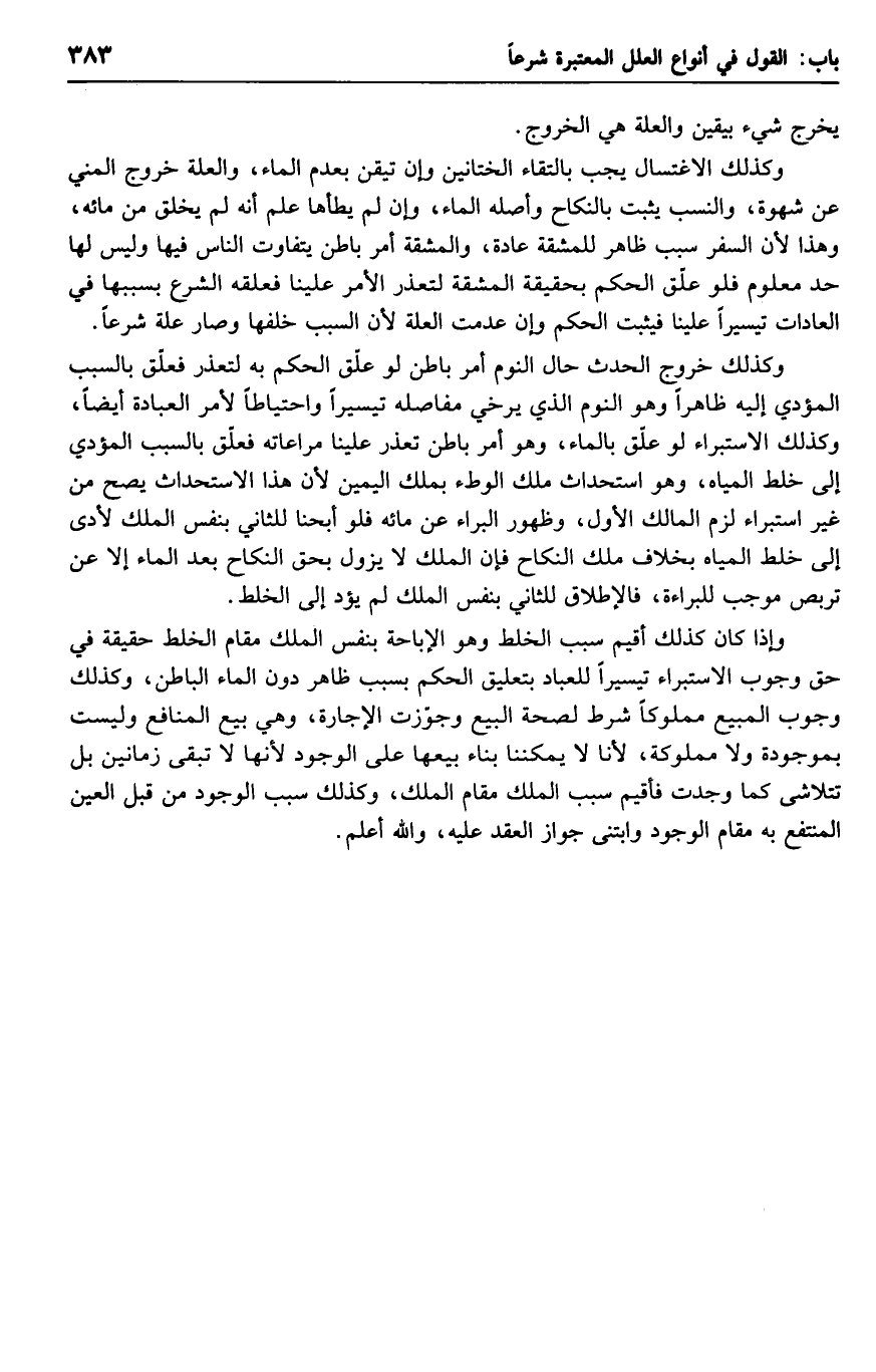 وإذا كان كذلك أقيم سبب الخلط وهو الإباحة بنفس الملك مقام الخلط حقيقة في حق وجوب الاستبراء تيسيرا للعباد بتعليق الحكم بسبب ظاهر دون الماء الباطن، وكذلك وجوب المبيع مملوكا شرط لصحة البيع وجوزت الإجازة، وهي بيع المنافع وليست بموجودة ولا مملوكة، لأنا لا يمكننا بناء بيعها على الوجود لأنها لا تبقى زمانين بل تتلاشى كما وجدت فأقيم سبب الملك مقام الملك، وكذلك سبب الوجود من قبل العين المنتفع به مقام الوجود وابتنى جواز العقد عليه، والله أعلم.