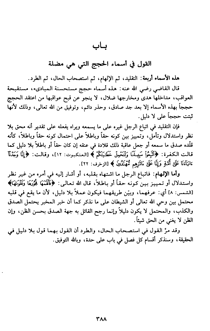 قال القاضي رضي الله عنه: هذه أسماء حجج مستحسنة المبادئ، مستقبحة العواقب، مداخلها هدى ومخارجها ضلال، لا ينجو عن قبح عواقبها من اعتقد الحجج حججا بهذه الأسماء إلا بعد جد صادق، وحذر دائم، وتوفيق من الله تعالى، وذلك لأنها ثبتت حججا على لا دليل.