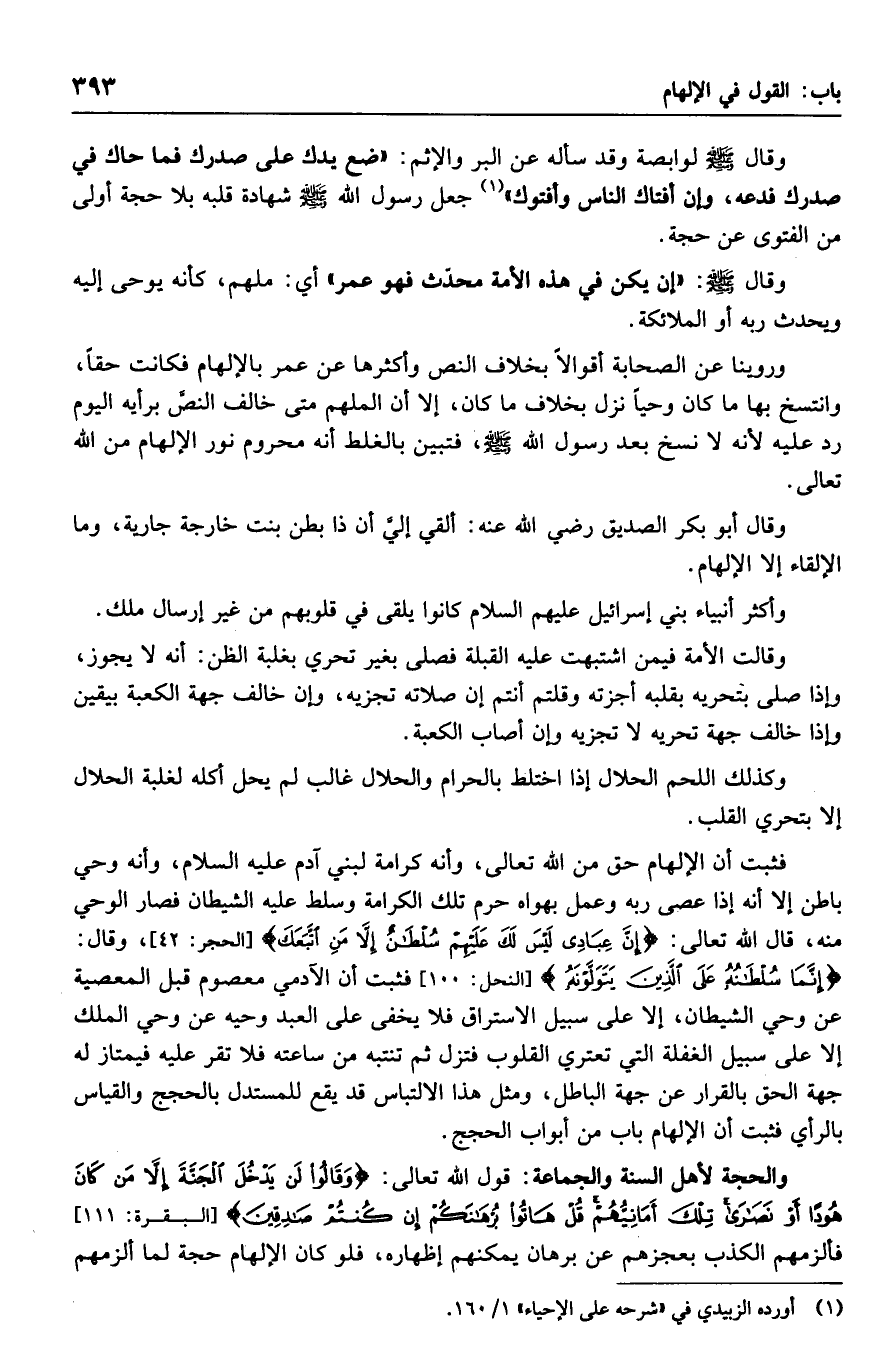 فثبت أن الإلهام حق من الله تعالى، وأنه كرامة لبني آدم عليه السلام، وأنه وحي باطن إلا أنه إذا عصى ربه وعمل بهواه حرم تلك الكرامة وسلط عليه الشيطان فصار الوحي منه، قال الله تعالى: {إن عبادي ليس لك عليهم سلطان إلا من اتبعك}، وقال: {إنما سلطانه على الذين يتولونه} فثبت أن الآدمي معصوم قبل المعصية عن وحي الشيطان، إلا على سبيل الاستراق فلا يخفى على العبد وحيه عن وحي الملك إلا على سبيل الغفلة التي تعتري القلوب فتزل ثم تنتبه من ساعته فلا تقر عليه فيمتاز له جهة الحق بالقرار عن جهة الباطل، ومثل هذا الالتباس قد يقع للمستدل بالحجج والقياس بالرأي فثبت أن الإلهام باب من أبواب الحجج.