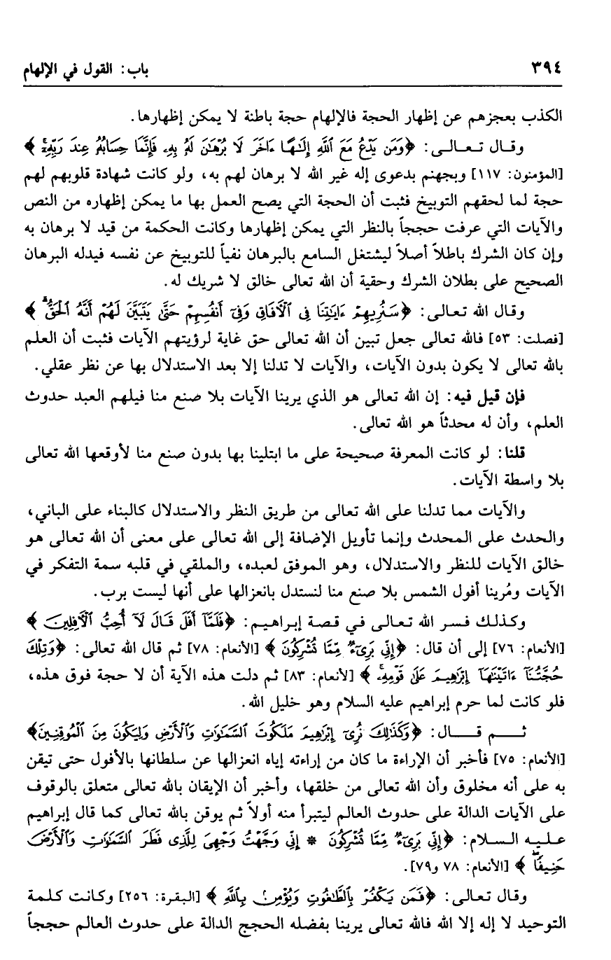 وقال تعالى: {ومن يدع مع الله إلها آخر لا برهان له به فإنما حسابه عند ربه} وبجهنم بدعوى إليه غير الله لا برهان لهم به، ولو كانت شهادة قلوبهم لهم حجة لما لحقهم التوبيخ فثبت أن الحجة التي يصح العمل بها ما يمكن إظهاره من النص والآيات التي عرفت حججا بالنظر التي يمكن إظهارها وكانت الحكمة من قيد لا برهان به وإن كان الشرك باطلا أصلا ليشتغل السامع بالبرهان نفيا للتوبيخ عن نفسه فيدله البرهان الصحيح على بطلان الشرك وحقية أن الله تعالى خالق لا شريك له.