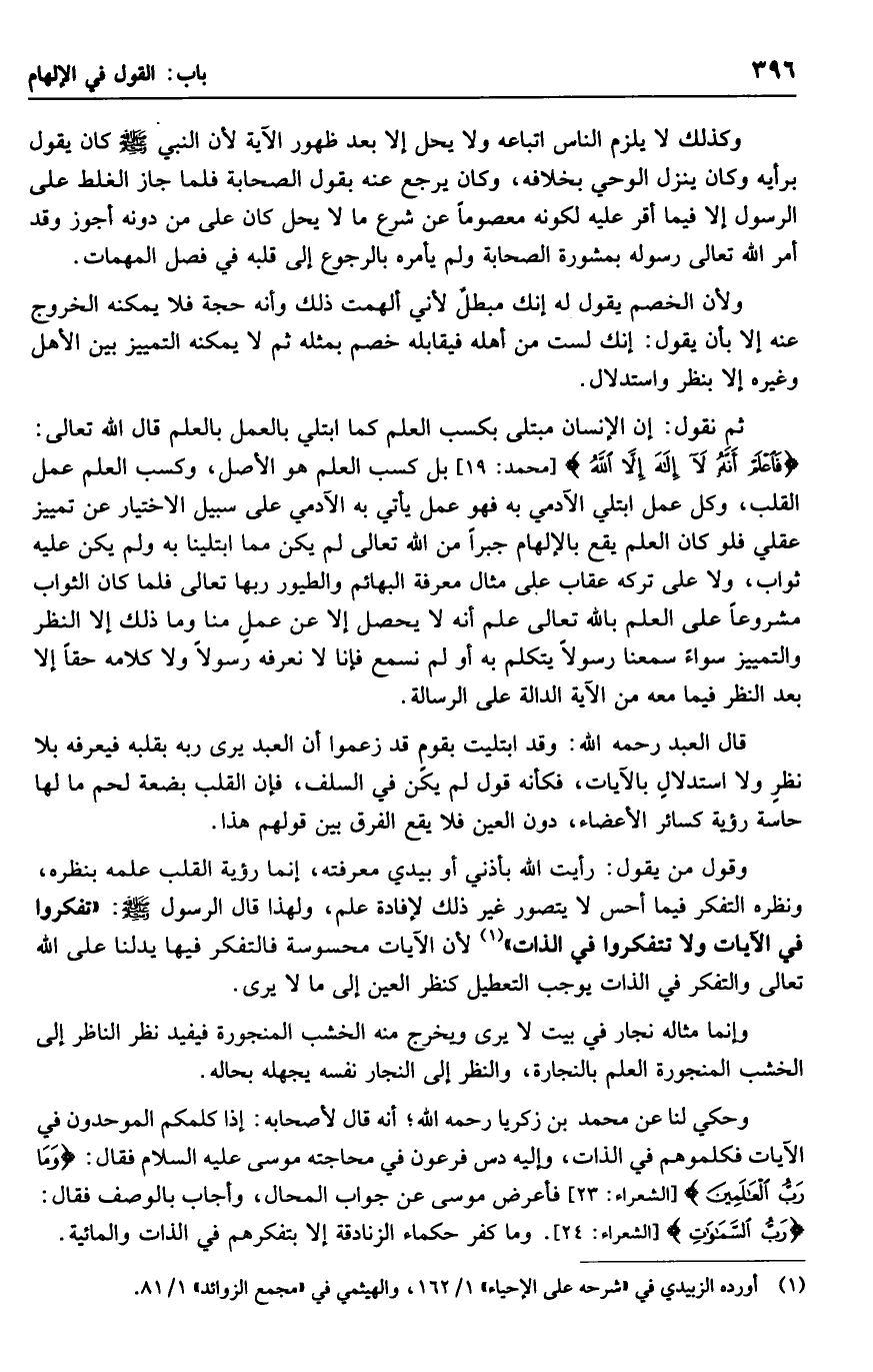 ثم نقول: إن الإنسان مبتلى بكسب العلام كما ابتلي بالعمل بالعلم قال الله تعالى: {فاعلم أنه لا إله إلا الله} بل كسب العلم هو الأصل، وكسب العلم عمل القلب، وكل عمل ابتلي الآدمي به فهو عمل يأتي الآدمي على سبيل الاختيار عن تمييز عقلي فلو كان العلم يقع بالإلهام جبرا من الله تعالى لم يكن مما ابتلينا به ولم يكن عليه ثواب، ولا على تركه عقاب على مثال معرفة البهائم والطيور ربها تعالى فلما كان الثواب مشروعا على العلم بالله تعالى علم أنه لا يحصل إلا عن عمل منا وما ذلك إلا النظر والتمييز سواء سمعنا رسولا يتكلم به أو لم نسمع فإنا لا نعرفه رسولا ولا كلامه حقا إلا بعد النظر فيما معه من الآية الدالة على الرسالة.