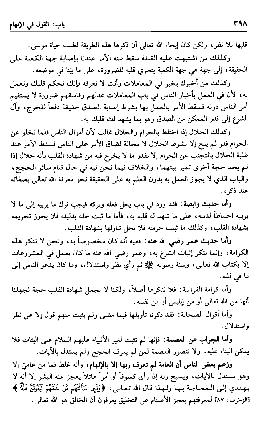 وأما حديث عمر رضي الله عنه: ففيه أنه كان مخصوصا به، ونحن لا ننكر هذه الكرامة، وإنما ننكر إثبات الشرع به، وعمر رضي الله عنه ما كان يعمل في المشروعات إلا بكتاب الله تعالى، وسنة رسوله صلى الله عليه وسلم ثم رأي نظر واستدلال، وما كان يدعو الناس إلى ما في قلبه.