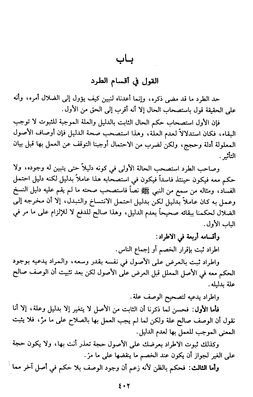 وصاحب الطرد استصحب الحالة الأولى في كونه دليلا حتى يتبين له وجوده، ولا حكم معه فيكون حينئذ فاسدا فيكون في استصحابه هذا عاملا بدليل لكنه دليل احتمل الفساد، ومثاله من سمع من النبي صلى الله عليه وسلم نصا فاستصحب صحته ما لم يقم عليه دليل النسخ وعمل به كان عاملا بدليل احتمل الانتساخ والتبدل، إلا أن مخرجه إلى الضلال لحكمنا ببقائه صحيحا بعدم الدليل، وهذا صالح للدفع لا للإلزام على ما مر في الباب الأول.