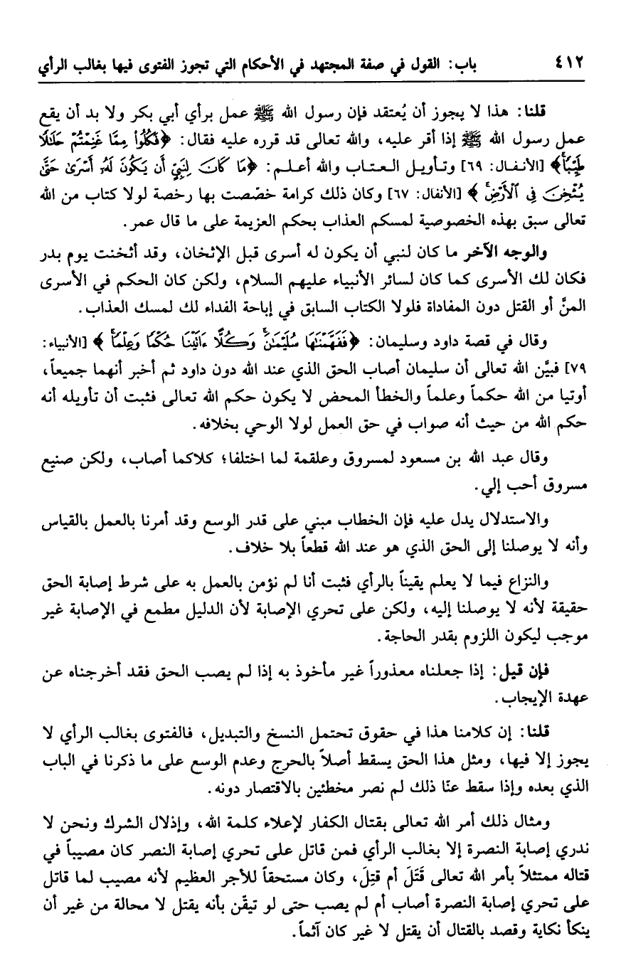 وقال في قصة داود وسليمان: {فهمنها سليمان وكلا ءاتينا حكماً وعلماً} فبين الله تعالى أن سليمان أصاب الحق الذي عند الله دون داود ثم أخبر أنهما جميعاً، أوتيا من الله حكماً وعلماً والخطأ المحض لا يكون حكم الله تعالى فثبت أن تأويله أنه حكم الله من حيث أنه صواب في حق العمل لولا الوحي بخلافه.