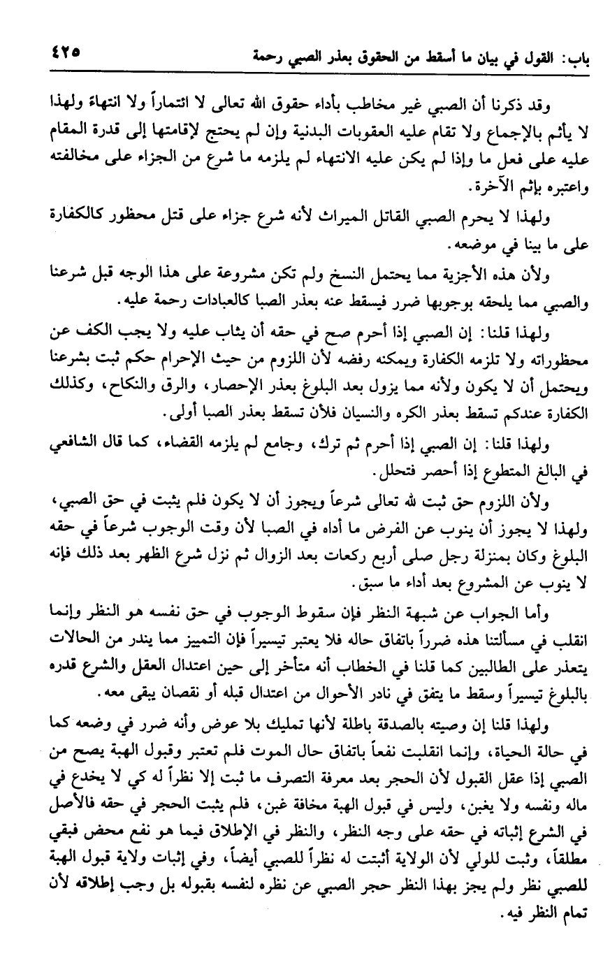 وأما الجواب عن شبهة النظر فإن سقوط الوجوب في حق نفسه هو النظر وإنما انقلب في مسألتنا هذه ضرراً باتفاق حاله فلا يعتبر تيسيراً فإن التمييز مما يندر من الحالات يتعذر على الطالبين كما قلنا في الخطاب أنه متأخر إلى حين اعتدال العقل والشرع قدره بالبلوغ تيسيراً وسقط ما يتفق في نادر الأحوال من اعتدال قبله أو نقصان يبقى معه.
