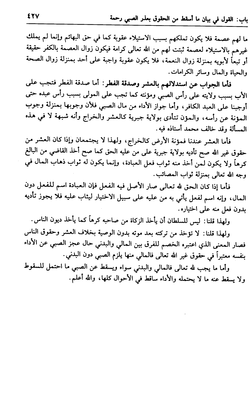فأما الجواب عن استدلالهم بالعشر وصدقة الفطر: أما صدقة الفطر فتجب على الأب بسبب ولايته على رأس الصبي ومؤنته كما تجب على المولى بسبب رأس عبده حتى أوجبنا على العبد الكافر، وأما جواز الأداء من مال الصبي فلأن وجوبها بمنزلة وجوب المؤنة عن رأسه، والمؤن تتأدى بولاية جبرية كالعشر والخراج وأنه شبهه لا في هذه المسألة وقد خالف محمد أستاذه فيه.