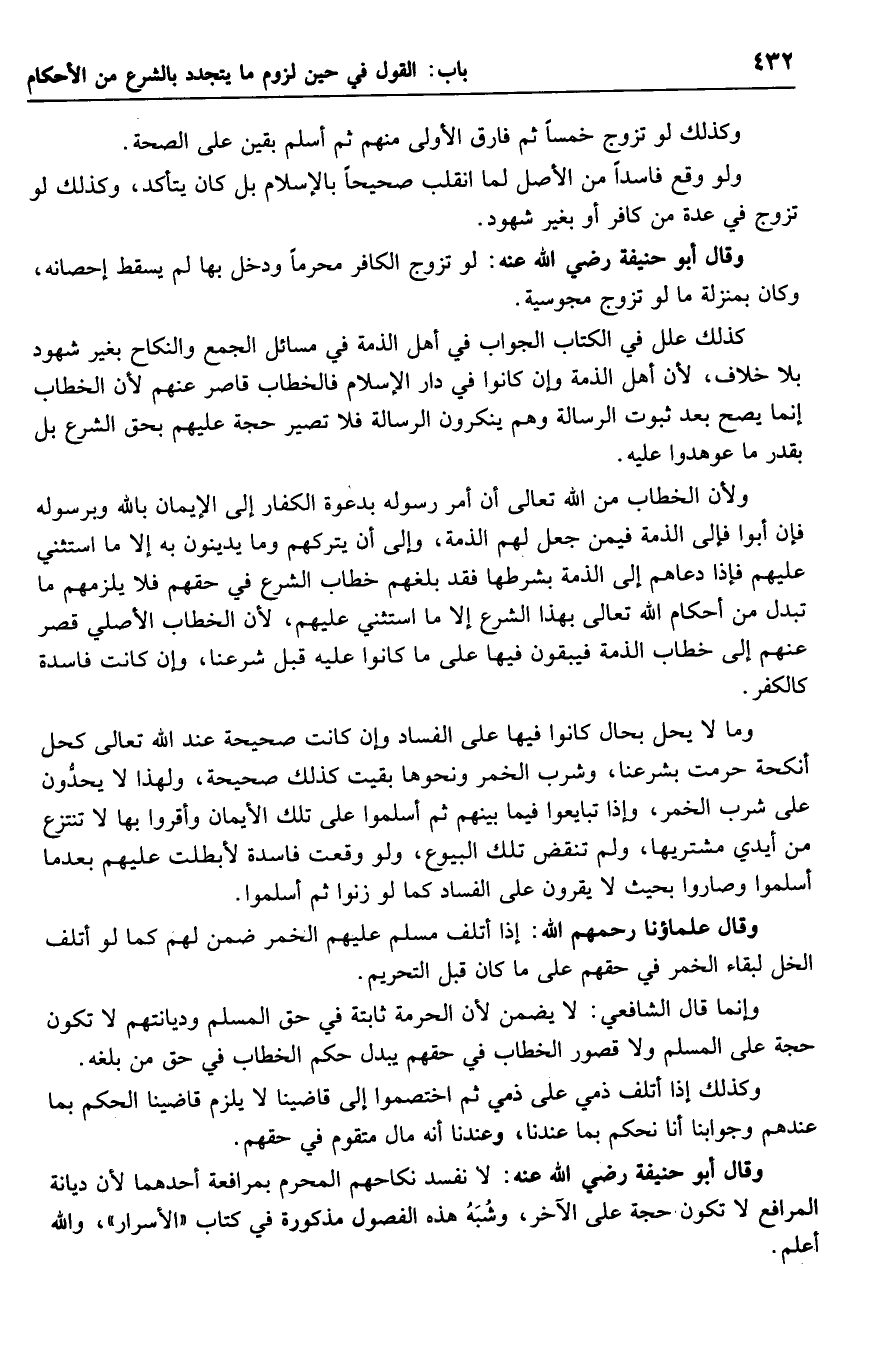 وقال أبو حنيفة رضي الله عنه: لا نفسد نكاحهم المحرم بمرافعة أحدهما لأن ديانة المرافع لا تكون حجة على الآخر، وشبه هذه الفصول مذكورة في كتاب (الأسرار)، والله أعلم.